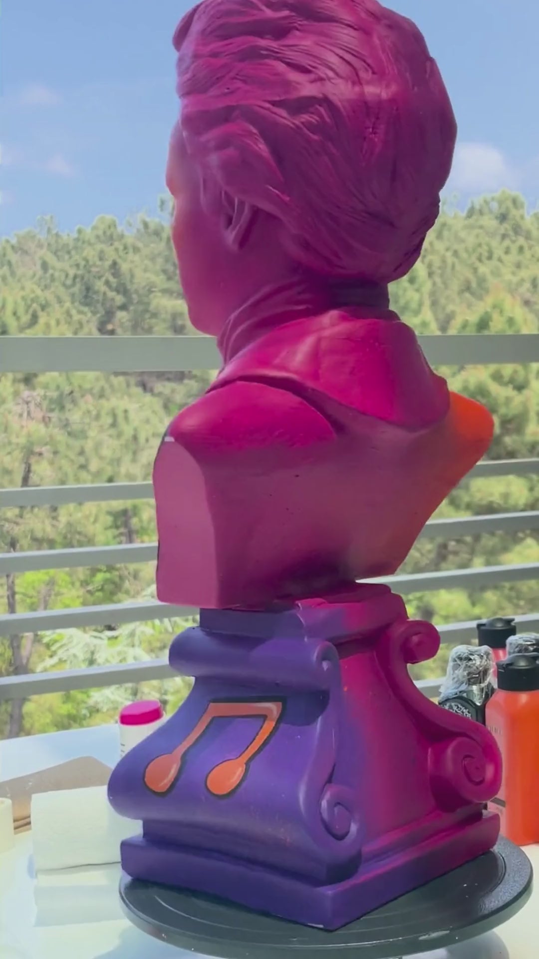 Surrounding the sculpture, a dynamic tapestry of vibrant colors and geometric patterns evokes the symphonies and sonatas that flowed from Beethoven's creative soul. The fusion of classical forms with contemporary elements infuses the sculpture with a sense of artistic innovation, reflecting Beethoven's own groundbreaking contributions to the world of music.